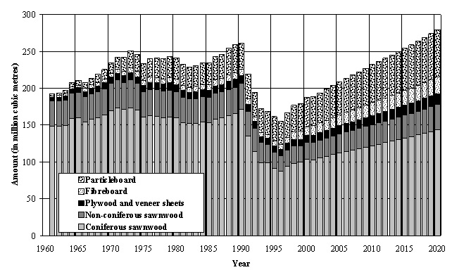 Production and consumption of coniferous sawnwood are expected to grow at an average annual rate of 1.0 percent and 0.8 percent respectively. At the end of the 1990s, annual production in Western Europe amounted to 73 million m3, while annual consumption amounted to 76 million m3. By 2020, production and consumption are both expected to reach 89 million m3 and Western Europe will no longer be a net importer of coniferous sawnwood.