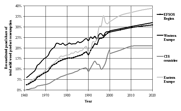 Overall, the structural changes in markets described in Section 2.3.4 are expected to continue in the future, but at different rates in each of the three European sub-regions. For example, for Europe as a whole, consumption of reconstituted panels is expected to continue to account for a greater share of consumption of solid wood products in the future, due to higher growth in fibreboard and particleboard consumption compared to the expected growth in sawnwood consumption.