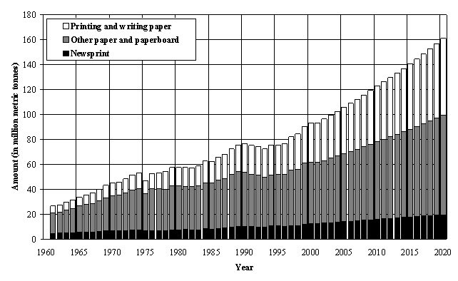 Projections for the production and consumption of recovered paper were based on an analysis of the historical trends in wastepaper recovery and the utilisation of recovered paper in paper and paperboard production. The policy analysis showed that both of these variables are expected to continue to follow past trends and increase in the future. However, there are technical limits to both of these variables; for example, some types of paper are very difficult to recover (e.g. household and tissue paper) and, as already noted, some types of paper are difficult to manufacture from recycled paper.