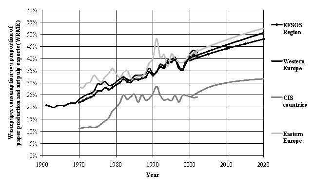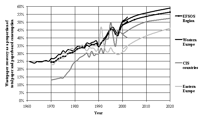 The projections for both of these variables were based on a simple extrapolation of past trends, subject to the limitations described above. For countries where these figures were already high, it was assumed that they would not increase. For countries that have experienced some growth in the past, the trends in wastepaper recovery were continued up to a limit of 50 - 60 percent, depending on the level of urbanisation in the country (recovery rates are generally higher in more urbanised countries). Trends in the use of recovered paper were also extrapolated (up to a limit of 70 percent in the few countries with high historical rates of recovered paper utilisation). For countries where the historical trends showed low rates of wastepaper recovery and utilisation, it was assumed that both variables would grow modestly by about 10 - 15 percentage points in total over the next two decades.