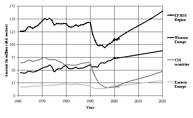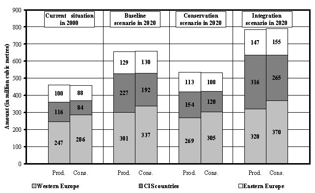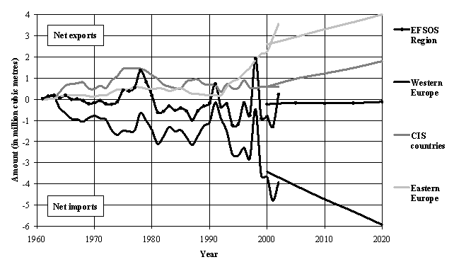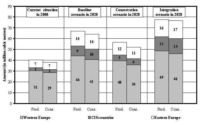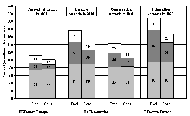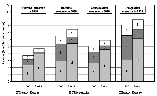 However, net exports from Eastern Europe are likely to persist and will even increase slightly. In addition, production and consumption will expand twice as fast as in the West, with an average annual growth rate of 2.1 percent. Annual production and consumption of 19 million m3 and 12 million m3 respectively at the end of the 1990s will increase to 28 million m3 and 19 million m3 respectively by 2020, leading to a very small increase in net exports from this sub-region.