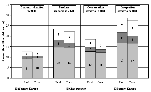 The conservation scenario implies a very modest increase in the production and consumption of industrial roundwood in all three sub-regions, which can easily be achieved with the available forest resource. However, under the integration scenario, some countries in Western and Eastern Europe would find it difficult to meet additional demands from domestic forest resources.