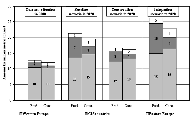 The reduced impact of the alternative scenarios on production and consumption is due to the dominance of Western Europe in this market and the low sensitivity in this sub-region to the underlying differences between the alternative scenarios. For example, total growth in production and consumption would only change by about one-third under the conservation and integration scenarios (compared with the baseline scenario).