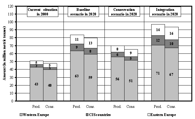 Again, this market is dominated by Western Europe, where market expansion is not greatly affected by the choice of scenario. The baseline projection for Western Europe shows growth in production and consumption of 55 percent and 76 percent by 2020. Under the conservation scenario, total growth would only amount to 39 percent and 50 percent for production and consumption respectively. Under the integration scenario, the corresponding figures would be 70 percent and 104 percent. The much greater sensitivity of consumption to the choice of scenario also affects the net trade position for Western Europe (and Europe as a whole), with a significant level of net exports in 2020 under the conservation scenario and a much lower level of net exports under the integration scenario.