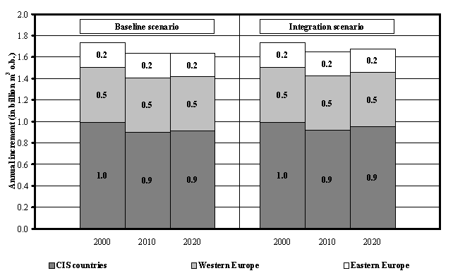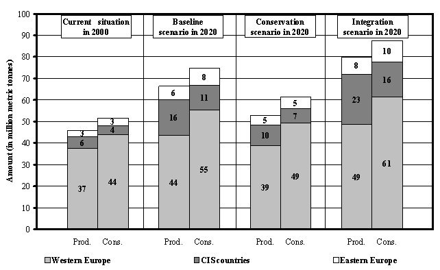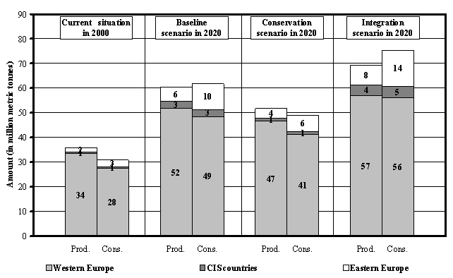In Eastern Europe, projected total growth in production and consumption is 246 percent and 282 percent respectively under the baseline scenario. The corresponding figures under the conservation scenario are 124 percent and 127 percent, or around half of the expected increase under the baseline scenario. The integration scenario shows a similar change in market expansion in the opposite direction, with an increase in the growth in production and consumption by more than 50 percent. The different levels of growth in East European consumption also contribute significantly to the differences in net trade in Europe under the alternative scenarios.