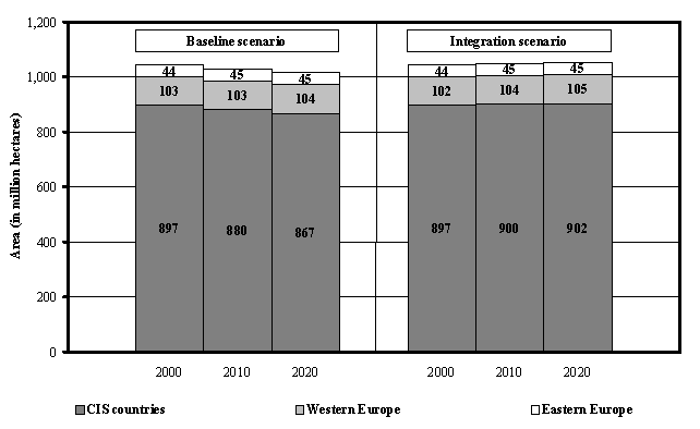 Figure 131 shows the outlook for FAWS area under the two alternative scenarios. Under the baseline scenario, it is expected that the total FAWS area in Europe will decline by about 28 million hectares. However, this decline is all due to the projected decrease of 30 million ha in the FAWS area in the CIS sub-region. In contrast to this, a very slight increase in the FAWS area is expected in the future in Western and Eastern Europe (and in the majority of countries included in these two sub-regions).