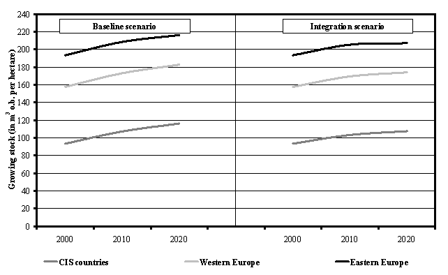 Figure 133 presents this information in a slightly different way, showing the projected level of growing stock per hectare in each of the three sub-regions under the two alternative scenarios. This shows that growing stock volume per hectare will continue to increase under the baseline scenario. Under the integration scenario, the increase in growing stock per hectare will slow down over the next 20 years. In particular, in Eastern Europe, it will level-off by 2020 at a level of around 210 m3 per hectare.