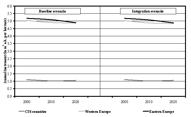 The projections of annual increment per hectare present a slightly different picture, with a slight decline in annual increment projected for Western and Eastern Europe and very little change projected for the CIS sub-region. Furthermore, there is very little difference between the two alternative scenarios. The reasons behind these changes are complex and are related to the age-class structure of European forests.