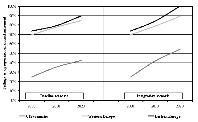 The volume of growing stock is also expected to increase under the integration scenario, but by about 15 percent less than under the baseline scenario. Under this scenario, the European growing stock volume is projected to increase to 125 billion m3 o.b. by 2020. Again, the CIS sub-region accounts for the majority of this increase. In Western Europe, growing stock volume is expected to increase slightly at first, but remain about the same over the period 2010 to 2020. In Eastern Europe, very little increase in the growing stock volume is projected for the whole period 2000 to 2020 under this scenario. This reduction in the projected increase in growing stock volume is due to the fact that the level of fellings will approach the level of increment in these two sub-regions under this scenario (see below).