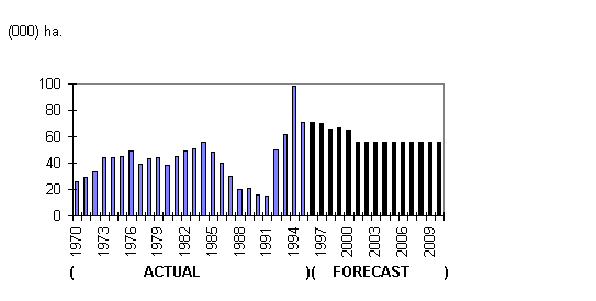 In the longer term, from the year 2001 to the year 2010, the report expects new planting to be between 37,000 and 92,000 hectares with a best estimate of 56,500 hectares per year. While, intuitively, these best estimates seem more likely to comprise an upper bound, even the minimum estimates will be sufficient to expand New Zealand's planted resource to around 1.9 million hectares by 2010. Figure 3 shows a comparison between historical planting rates and the forecast rates.
