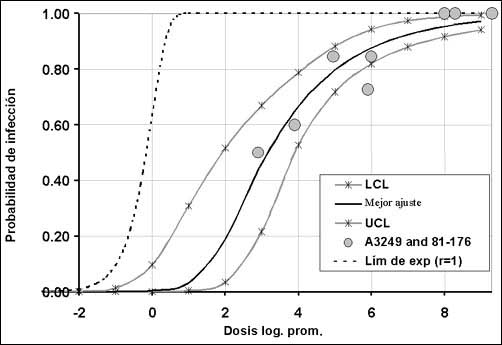 La probabilidad de enfermedad depende de la probabilidad de infección. Usando los datos del estudio piloto de alimentación humana, no parece haber una clara tendencia para el comportamiento de esta probabilidad condicionada. Cuando se combinan los datos de ambas cepas, la probabilidad condicional tiende a exhibir una relación independiente de la dosis (Figura 5.2). Es importante reconocer que a pesar de que la probabilidad condicionada es independiente de la dosis, la probabilidad última de enfermedad aumenta con la dosis ingerida.