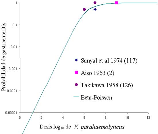 La Figura 6.1 muestra la curva dosis-respuesta más probable para V. parahaemolyticus; sin embargo, no se muestra la familia de curvas que representan la imprecisión alrededor de la curva. Estos datos corresponden a estudios en voluntarios humanos sanos donde la enfermedad gastrointestinal se usó como respuesta final.