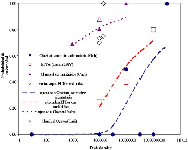 La Figura 6.2 muestra los ajustes más probables de los datos de voluntarios sanos para diversos biotipos y serotipos de V. cholerae. Una vez más, la imprecisión está representada por una familia de curvas alrededor de cada una de las curvas más probables, pero esto no se muestra. El punto final modelado es la enfermedad gastrointestinal. Los datos indican que el consumo de V. cholerae con los alimentos puede desplazar significativamente la curva dosis-respuesta hacia la derecha, indicando que una dosis más elevada de V. cholerae es necesaria para causar enfermedad en una cantidad comparable de voluntarios cuando se consume V. cholerae con los alimentos. Se desconoce si matrices alimentarias específicas tienen efectos mayores o menores en la variación de la relación dosis-respuesta.
