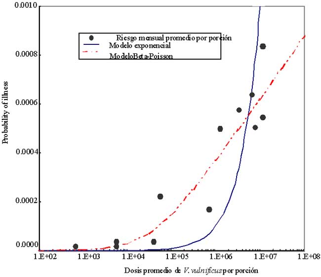 Hay estudios en voluntarios humanos para la construcción de las curvas dosis-respuesta para V. parahaemolyticus y V. cholerae. Estos datos se analizaron utilizando rutinas de ajuste de curvas para encontrar el mejor ajuste para la curva dosis-respuesta Beta-Poisson. Debido a los escasos datos para los estudios con voluntarios humanos, se determinan múltiples curvas-ajustes usando técnicas de remuestreo. Las múltiples curvas dosis-respuesta Beta-Poisson resultantes pueden usarse en la caracterización de riesgos. Estas múltiples curvas dosis-respuesta representan una incertidumbre clave en la evaluación de riesgos. Para V. vulnificus, no hubo datos en voluntarios humanos y se intentó un enfoque alternativo. Se estimó la relación dosis-respuesta ajustando el modelo Beta-Poisson usando niveles mensuales de V. vulnificus en ostras del Golfo de México en Estados Unidos y el consumo estimado de ostras crudas con casos notificados mensualmente de septicemia asociada con V. vulnificus en los EE.UU. Con más investigación, esta relación de riesgos puede aplicarse a la evaluación de riesgos del V. vulnificus y ser validada con datos sobre la distribución de V. vulnificus en ostras crudas en el punto de venta minorista.