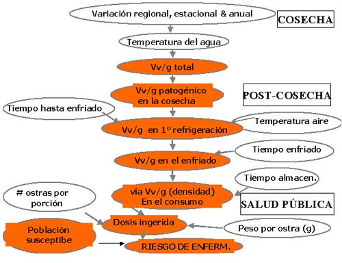 En 1999, la Administración de Alimentos y Drogas de los EE.UU. (FDA) inició una evaluación de riesgos para caracterizar el impacto sobre la salud pública del consumo de ostras crudas contaminadas con V. parahaemolyticus. La Evaluación de Riesgos Preliminar de la FDA de Impactos sobre la Salud Pública de V. parahaemolyticus en Moluscos Crudos (FDA-VPRA) fue publicada para comentario público en el año 2001. La FDA-VPRA contiene diversas conexiones claves entre la prevalencia de V. parahaemolyticus en ostras y la temperatura, principalmente la temperatura de las aguas de recolección y de las ostras en toda la secuencia post recolección-venta minorista-consumo.