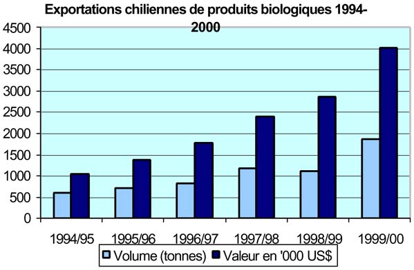 La filière biologique au Chili est née il y a seulement quelques années, et elle est encore de petite taille. Néanmoins, des avantages comparatifs pour l'approvisionnement en saison creuse des marchés de l'hémisphère nord et une expérience en matière d'exportation de produits frais offrent un grand potentiel de croissance à la filière biologique. Les principaux facteurs limitants sont la faiblesse institutionnelle et le manque de «savoir-faire» en matière de production biologique.