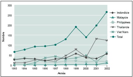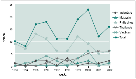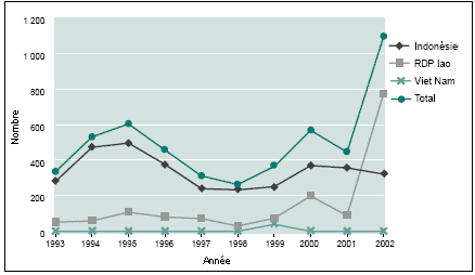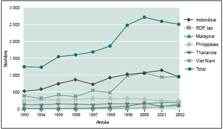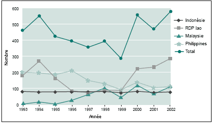 Les 35 institutions couvertes par l’enquête ont signalé au total 31 325 diplômés pour la période 1993-2002. Parmi les institutions ayant fait l’objet d’un sondage, le brevet n’était pas proposé en Thaïlande et au Viet Nam, alors que les institutions interrogées en Malaisie, aux Philippines ou en Thaïlande n’offraient pas de diplôme d’études secondaires et que la République démocratique populaire lao n’offrait pas de programme de maîtrise et de doctorat (tableau 2).