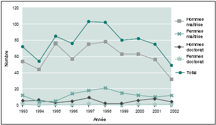 La tendance globale, dans l’enseignement de troisième cycle, fait clairement apparaître un creux depuis 1998. Cela est extrêmement inquiétant, compte tenu de l’augmentation du nombre d’institutions enseignant la foresterie et des besoins pressants en matière de recherche. La faiblesse des résultats de la recherche forestière en Afrique n’a rien d’étonnant.