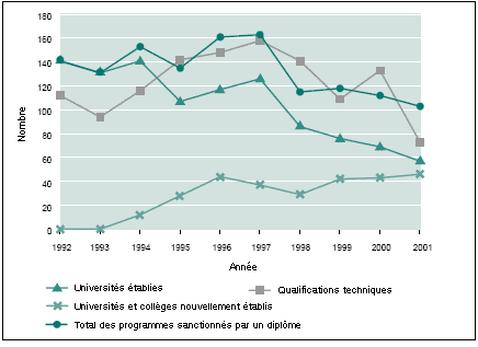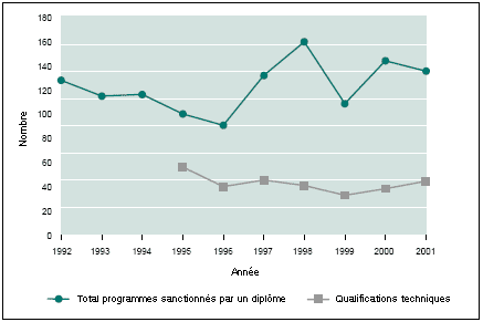 Les admissions aux études visant l’obtention de qualifications techniques ont, en fait, augmenté au cours de la première moitié de la décennie et n’ont baissé que la dernière année. Toutefois, ces chiffres masquaient un recul dans le nombre de candidats aux qualifications techniques de niveau supérieur (Higher National Diploma) à partir de 1998 environ. Ce recul a été compensé par les demandes d’inscription aux nouveaux programmes de niveau inférieur menant à un certificat dans des collèges qui, auparavant, n’offraient pas de telles occasions d’apprentissage.
