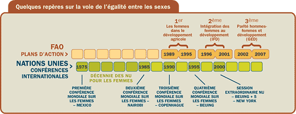 Depuis 1975, date de la première Conférence mondiale sur les femmes, à Mexico, la façon de traiter la question « femmes » dans le processus de développement a considérablement évolué. Les organismes de développement, dont la FAO, ont d'abord préconisé l'approche dite « Intégration des femmes au développement » (IFD) qui a permis de rendre plus visible l'importance du travail productif des femmes et de reconnaître leur rôle fondamental dans le développement. Cette approche met l'accent sur le besoin d'affecter des ressources à l'amélioration de la condition de la femme, notamment par le biais de projets en leur faveur.