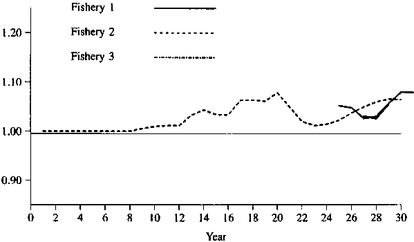 To estimate the amount of fishery interaction we set the catch from a fishery or group of fisheries to zero and, using the parameter estimates from the model, calculated the increased catch for the other fisheries, assuming that the fishing mortality rates for these fisheries remained the same. Some remarks concerning the limitations of this approach are in order.