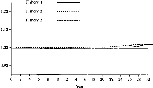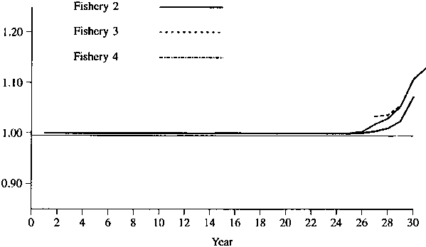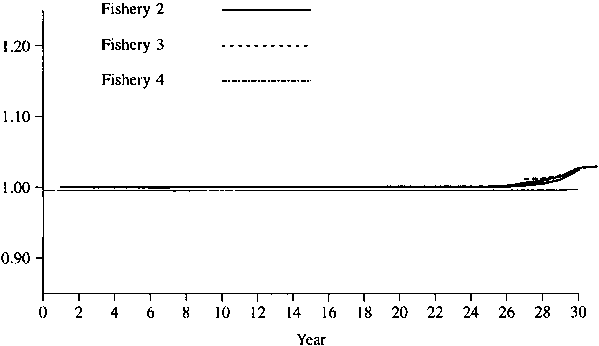 Figures 1 - 2 show the simulated results of setting the catch of fisheries 4 and 5 to 0. Figures 3-4 show the simulated results of setting the catch of fisheries 1 and 5 to 0. As one would expect, the effect is greater for a lower natural mortality rate. In any event, the maximum effect is only about 10%, so that one might conclude that there is no evidence of large amount of interaction for these data.