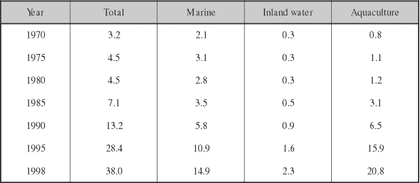 In China, there has been an explosive expansion of fish production, particularly through inland water and aquaculture activities but also from marine fisheries (see Table 2). This extraordinary rate of growth followed fundamental changes in state policies, in particular the decentralisation of production system responsibilities and overall moves towards a market-orientated economy. It is notable that Chinese fishing capacity has expanded even faster than production. The heavy exploitation of most marine resources in Chinese waters and the strongly emerging consumer market have provided the impetus for China to develop a distant-water fishing fleet, first introduced in 1985.
