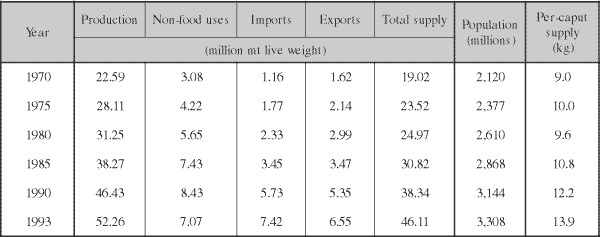 Table 3 shows the evolution of total and per-caput supplies of food fish in the Asia and Pacific region from 1970-93. During this period, the total annual domestic production of food fish expanded by a remarkable 30 million mt. However, such was the rise in the quantity diverted to non-food uses (from c. 3 million mt in 1970 to between 7 and 8 million mt annually over the last decade or so of the period) or consigned abroad as exports (a growth from 1.6 million to 6.5 million mt p.a.) that a very substantial expansion in imports was necessary, first simply to maintain, and more recently to augment per-caput supplies for a rapidly increasing regional population. It is a measure of the welcome improvement achieved in the contribution of fish to overall regional food security that, despite these pressures, average per-caput supplies rose from 9 kg in 1970 to almost 14 kg by 1993, a 54 percent increase. This outstrips the growth attained on a world wide basis, global per-caput supplies having risen over the period from 10.8 kg to 13.4 kg, an improvement of 30 percent.