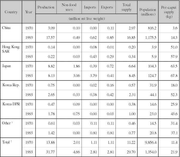 2 Excludes Macao and Mongolia where fish supplies are very small, although per-caput consumption in Macao in 1993 was c. 38 kg (v. 23 kg in 1970); in Mongolia per-caput supplies are between 0.5 and 1.0 kg.