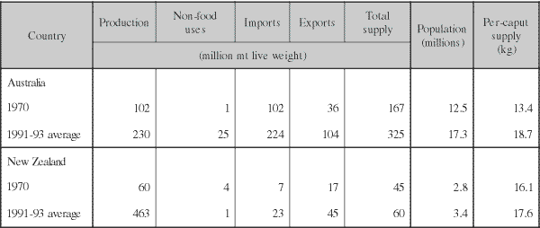 In Australia and New Zealand, per-caput demand for food fish could well rise to over 27 kg p.a., leading, in conjunction with population growth, to a total demand of about 700,000 mt by 2010. Supplies from capture fisheries are unlikely to increase very much, perhaps to around 750,000 mt p.a.; in the case of aquaculture, a continuance of recent trends in output would indicate the possible production of some 160,000 mt in 2010. Thus, if current developments with both exports and imports continue, there will be no negative implications for fish supplies or for food security.