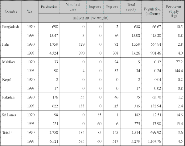 Nevertheless, fish plays an important role in food security throughout most of South Asia, notably as a condiment with rice which, together with other cereals and vegetables accounts for well over 80 percent of the total protein supply. The most significant increase in fish supplies, both in total and per-caput amounts, has been in India where domestic production, particularly from aquaculture, rose from 1.75 million mt in 1970 to 4.3 million mt by 1993, permitting a growth in per-caput consumption from 2.8 kg to 4 kg, notwithstanding a very substantial increase in the population. A similar development, albeit from a very low base, can be observed in Pakistan where per-caput supplies doubled over the period 1970-93. In Bangladesh, successive cyclones and floods have constrained the growth of both agricultural and fisheries output. Fish plays a very minor dietary role in land-locked Nepal, despite an encouraging rate of growth in output from both freshwater capture fisheries and aquaculture.