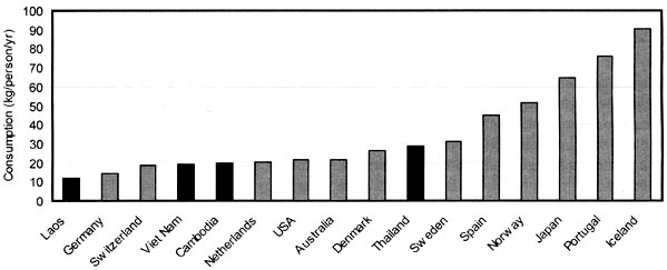Figure 1 FAO estimates for consumption of all seafood (fish and aquatic animals) for some developed countries, compared with FAO data for LMB countries (in black). Based on FAO website data for 2000