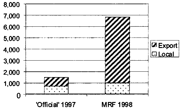 The increase in the catch can be explained by the increase in effort, particularly gillnets (Table 1). Figure 1 shows a comparison between the official statistics on landings at Nam Ngum in 1997 and the estimate of 1998 total landings by MRF I. The official figure was obtained from trade data supplied by the monopolist fish trader (fish exported from the reservoir), and adding an estimate of local fish consumption (Schouten, 1998). The 1998 fisheries total landings were estimated by catch-effort sampling and a fishing effort survey. The amount consumed locally was estimated from a survey carried out among villagers living around the reservoir.