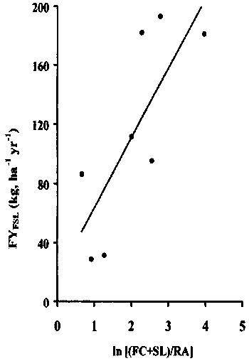 Amarasinghe et al. (2002) have shown the robustness of yield predictive models based on catchment features of reservoirs that were quantified by Geographical Information Systems (GIS). In these models, the ratio of catchment land-use patterns to the reservoir area or reservoir capacity is used as a predictor variable of fish yield. Of the various reservoir catchment land-use patterns, forest cover and shrub cover either singly or in combination had significant influences on yield. These relationships are shown in Fig. 3.