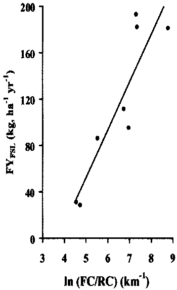 Reservoir fish yield (FY in kg/ha/year) and fishing intensity (FI expressed as boat-days ha/year) are linearly related according to the following equation (Fig. 2).