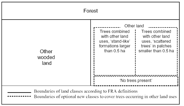 `Other wooded land' and `Trees outside forests' are terms found only in the FRA set of definitions (Box 1.1). The need for harmonization may arise from a desire to increase compatibility with the UNFCCC terminology which defines land areas eligible for `revegetation'. Were the terms compatible, the FRA data would directly benefit the UNFCCC in terms of monitoring changes in carbon stock.