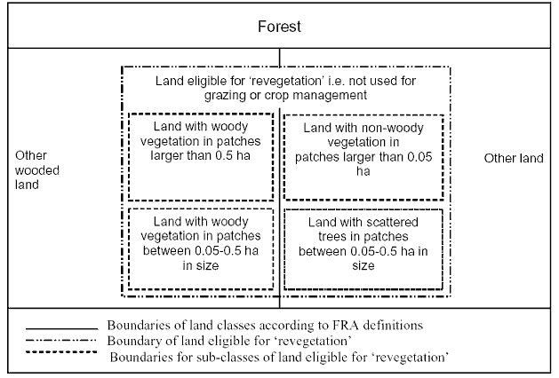 The relationship between the FRA land classification and land eligible for `reforestation' is illustrated in Figure 1.3 suggesting that harmonization of these definitions would be difficult because several new sub-classes should be created. The biggest hurdle is probably that the FRA land classes `other wooded land' and `other land' should be split according to land use, which would be a new practice. If harmonization of these definitions is considered useful, the first step would therefore be to find a common understanding on treatment of land use. Taking into account the fact that revegetation would probably be relevant only in a limited number of countries, a full harmonization may not be warranted because of the high cost involved as all countries should brake down their data accordingly.