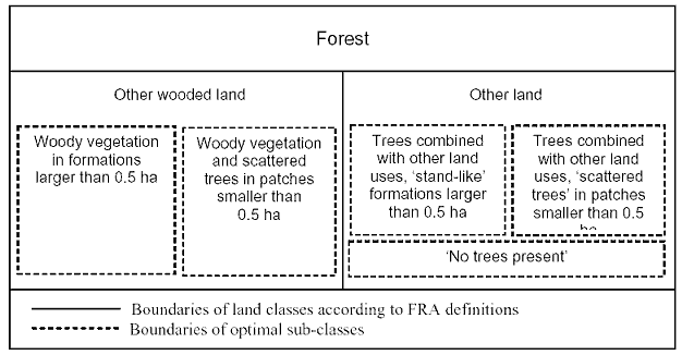 On the other hand, harmonization of these definitions could be achieved rather easily. It would suffice to split the land use class `other land' applied by FRA into three classes: one would denote areas where trees are combined with other land uses in `stand-like' formations within `other land'. The second class would include `scattered trees', i.e. patches below 0.5 ha (FRA minimum size). This corresponds to the existing FRA definition `trees outside forest areas'. It is debatable whether a lower boundary such as 0.05 ha (UNFCCC minimum size) should be established. It may be an impossible condition to meet, because such high-resolution data are rarely available. It may be sufficient to establish a new class without a lower boundary. The remaining area under `other land' would constitute the third class of `no trees present'.
