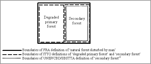 The ITTO definitions distinguish between degraded primary forests and secondary forests, while the FRA definition combines them under one definition. The CBD provides only one definition for secondary forest.