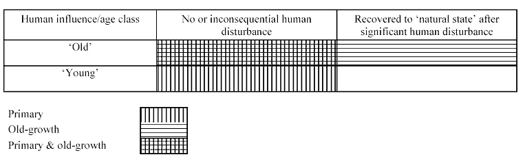 (i) old primary forest: old forests with no or inconsequential human disturbance