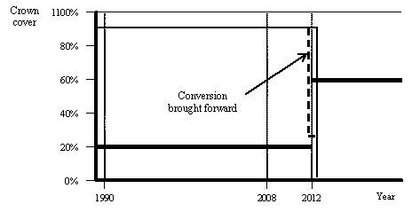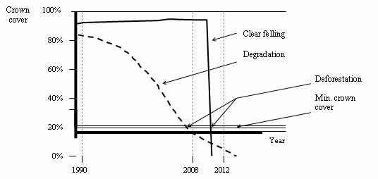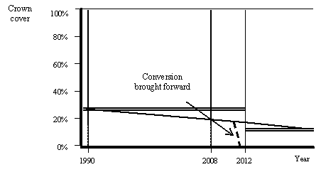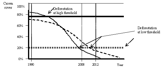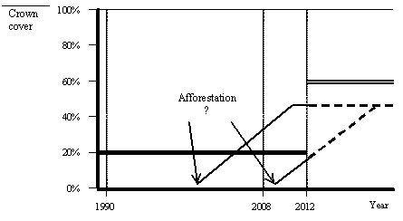 52As an example, the minimum area could be defined as the square of three times the height of the dominant tree class. This would result in a minimum of one hectare for trees 33 metres tall, and 0.0225 hectare for 5 metres tall vegetation.
