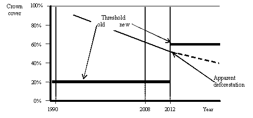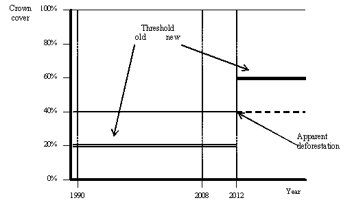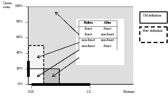 5. The analysis of the implications of changing from one forest definition to another (be it biome-specific or otherwise) identified areas of concern. A change in forest definition between commitment periods will require double accounting (at least for the time of the changeover). In addition, it will inevitably create apparent changes in the amount of forest indicated, even if there is no actual change in the amount of woody vegetation. These apparent gains and/or losses of forest area will have to be differentiated from actual changes in woody vegetation. Separating accounted changes owing to real processes and those resulting from the definition change may pose considerable methodological problems. A change in forest definition may also lead to paradoxical situations, may generate perverse incentives and may provide opportunities for abuses of the system.