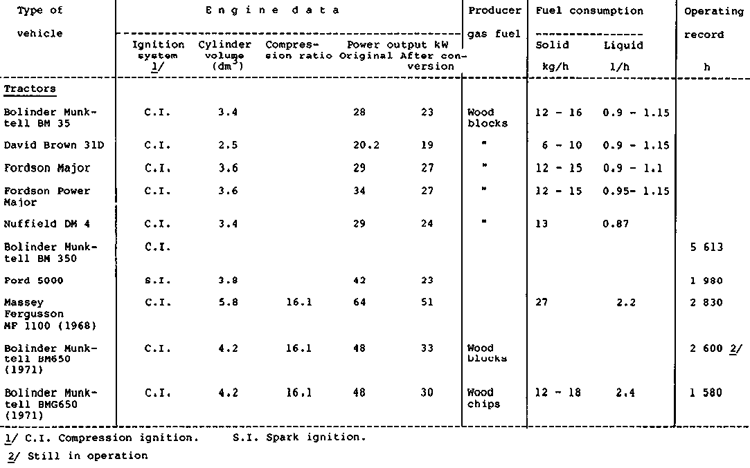 Producer gas was used as a substitute fuel for almost all the vehicles operated in Sweden during the Second World War. Some improvements of the gasifier and the gas cleaning technology have been made since then. This does not necessarily mean that producer gas is still a realistic option for substitution of petroleum fuels in case of a supply crisis. The current engines are different from those used in the forties and so are the vehicles. For an assessment of the present possibilities of producer gas, it is therefore important to collect and evaluate experiences from operation of modern vehicles with this fuel. Tables 3.10 and 3.11 list tractors and trucks converted to producer gas in Sweden after the Second World War. The majority have been converted and tested by the National Swedish Testing Institute for Agricultural Machinery, and have been used for practical operation for several years, monitored by the Institute. These tests have been concentrated on dual fuelling of compression-ignition engines. The operating experience now covers more than 65000 km for trucks and 15000 hours for tractors.