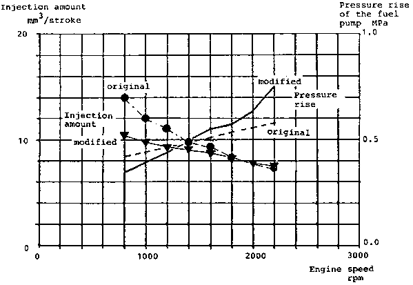 A constant injection amount was obtained by mounting an adjustment device for the fuel pressure normally used on pumps with an hydraulic speed governor. Fig. 3.10 shows the injection characteristics of the original and modified systems.