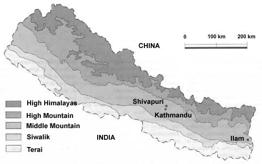 Nepal is a mountainous country; approximately 86 percent of the area is characterized by steep hills and mountains. Elevation ranges from 200 m to 8848 m (Mount Everest) within a radius of less than 200 km. The country comprises five distinct physiographic regions: the High Himalayas (23.7 percent of the total area), the High Mountains (19.7 percent), the Middle Mountains (29.5 percent), the Siwalik (12.7 percent) and the Terai (14.4 percent), (LRMP, 1986).