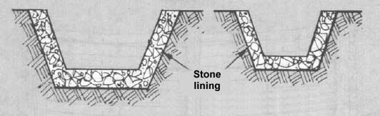 A road drainage system was constructed consisting of stone-lined drains on the cut-slope side of the travelway, pipe culverts, cross-drain box culverts, causeways, and surface cross-drains with water disposal into natural drainages and on to land surfaces. Construction of energy dissipators and establishment of vegetation cover were undertaken at disposal points to minimize the erosion potential of concentrated flow. Loose stone in conjunction with planting of utis and Napier was used at these disposal points (Hansen 1986, 1989).