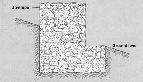 In areas where embankment filling was not practical and mass movement of road material might occur, gabion retaining walls were constructed according to standard engineering design. A series of loose stone-filled gabion boxes (usually of 1 x 1 m cross-section) were used to construct retaining walls to prevent down-slope movement of material.