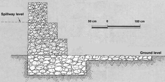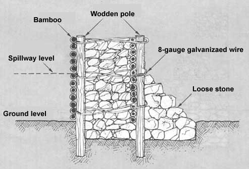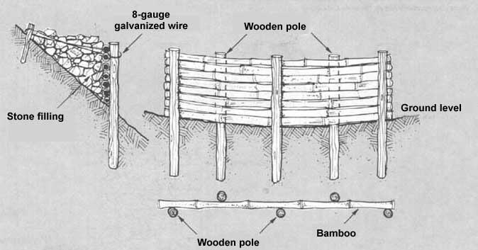The DSCWM began the task of stabilizing the slide area in 1975. During the first year, a detailed survey of the area was conducted to determine the causes of the initial slide and reasons for the continued mass movement. Also during the first year, some bamboo-cum-loose-stone check dams (see Figure 2) were constructed to begin control of rill and small gully erosion on the slide surface.