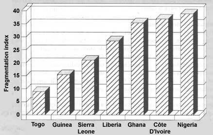 In addition to the estimations of forest cover area and its changes over time, the project has begun to quantify an aspect of forest distribution through the use of the Geographic Information System (GIS). Using a forest cover map derived from coarse-resolution satellite imagery, forest edges were measured to derive fragmentation indices, i.e. the amount of boundary area between forest and non-forest land compared with the area of total forest. A comparison of fragmentation for seven West African countries is shown in the figure. The higher the index value, the more complex is the edge between closed forests and other land conditions. The unevenness of distribution carries a number of socio-economic and environmental implications, and may also be an indicator of the likelihood of further deforestation.