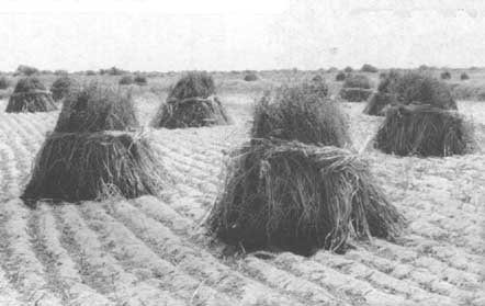 The interesting interaction of sesame drying racks A further interesting relationship of trees to the garden is provided by the racks for drying sesame. Being so easily dehiscent, sesame has to be carefully dried to avoid large losses of seed. It is dried on racks, called doro in Moru, made from long poles tied across a row of upright posts. The length of the rack depends on the amount of sesame grown, but as it is a major crop the amount of timber needed is not insignificant. The problem of getting enough timber is made worse by the fact that the sesame needs to be dried at a time of year when the grass is very long, making it difficult to move in the bush. So, as agricultural land use intensifies, suitable poles become more difficult to find in some areas. When the idea of planting trees round the compound was introduced, some farmers singled out the benefit for sesame drying racks as one of the major reasons for planting timber trees. |